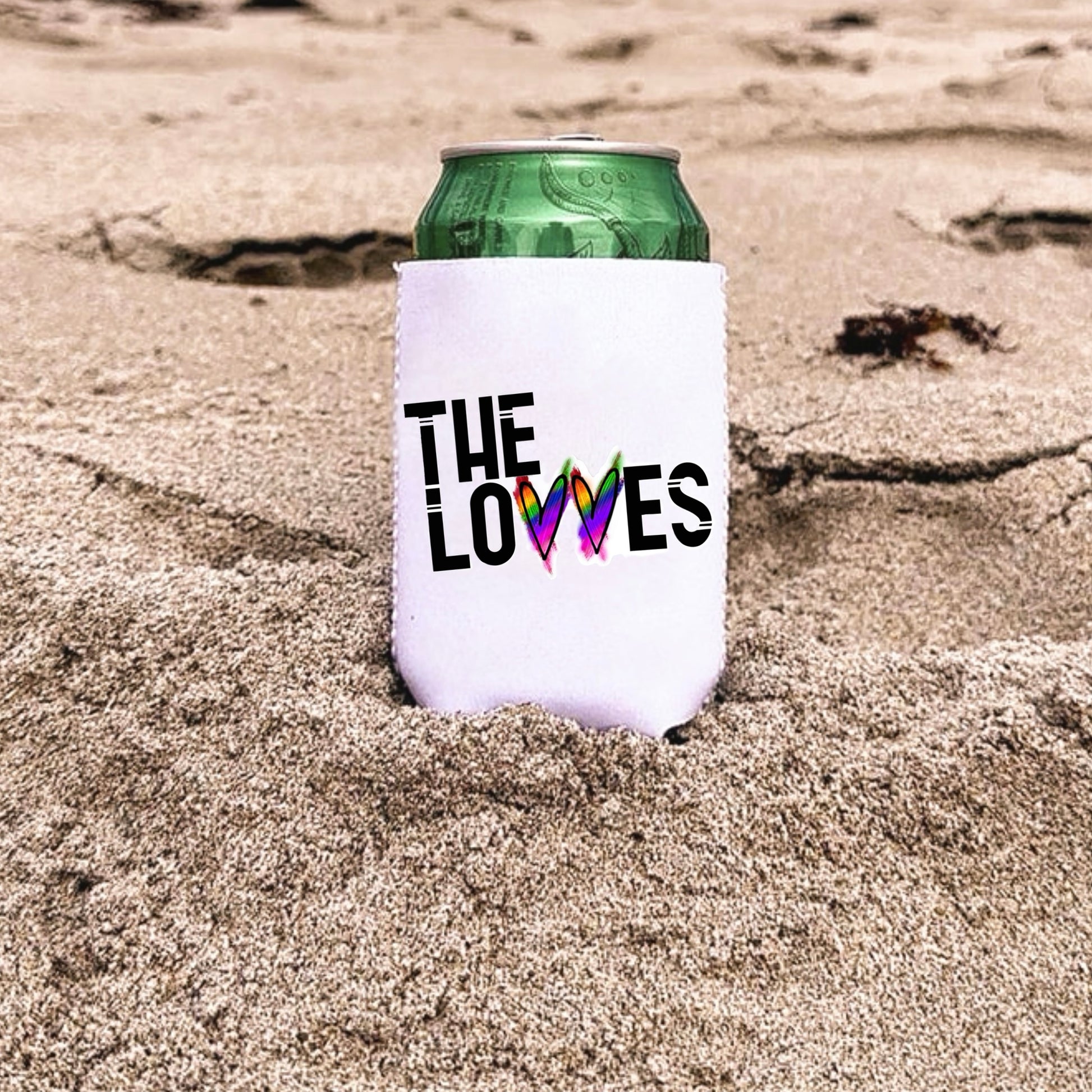 White collapsible neoprene koozie featuring The Lovves logo with prismatic rainbow accent. Fits regular sized cans.